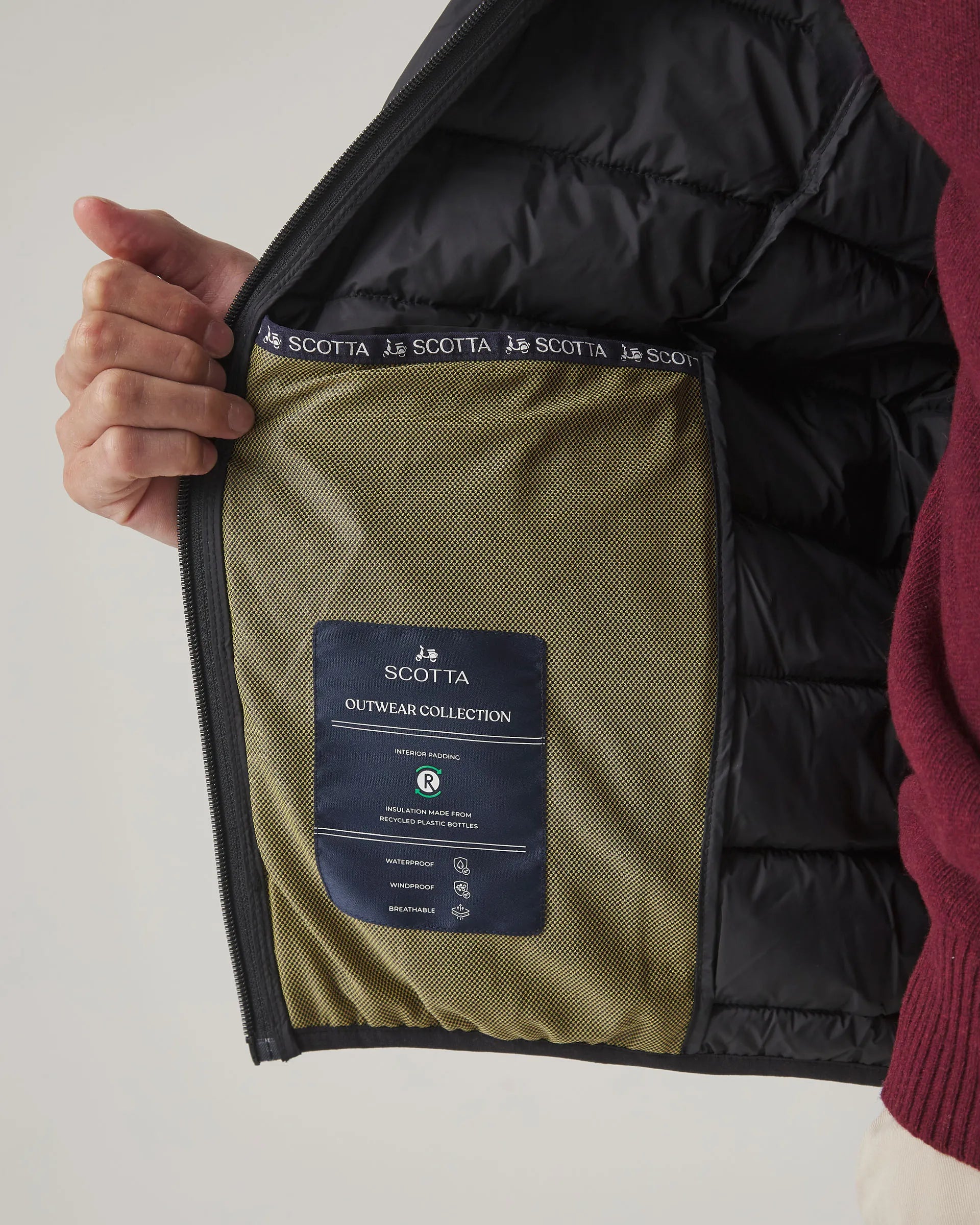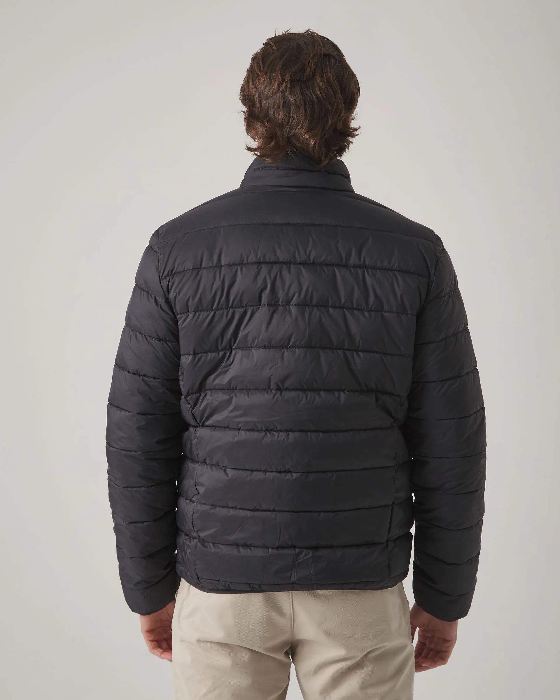Chaqueta negra acolchada de corte slim fit, confeccionado en tejido de nylon y poliéster con acabado water repellent, ideal para proteger del viento y la humedad ligera. Cuenta con cuello subido y cierre frontal de cremallera con tirador personalizado. Dispone de bolsillos laterales con cremallera y bolsillos interiores. Detalle de parche de goma en el pecho.