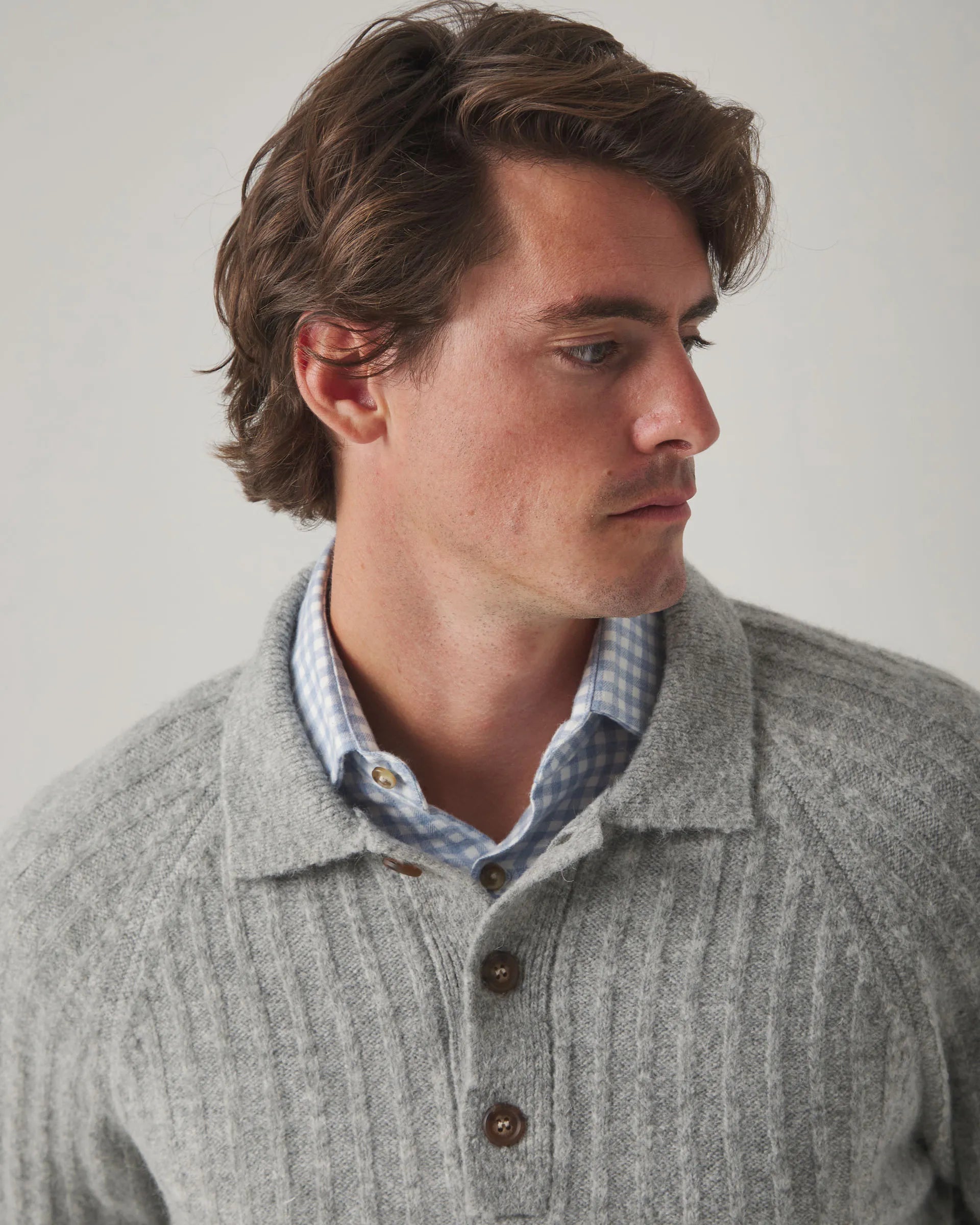 Jersey de canalé en gris, confeccionado en tejido de algodón y lana entre otros, con corte regular fit. Diseño de cuello de botones , manga larga y detalle de logo en la parte inferior. Aporta calidez y confort en días frescos, perfecto para días de invierno.