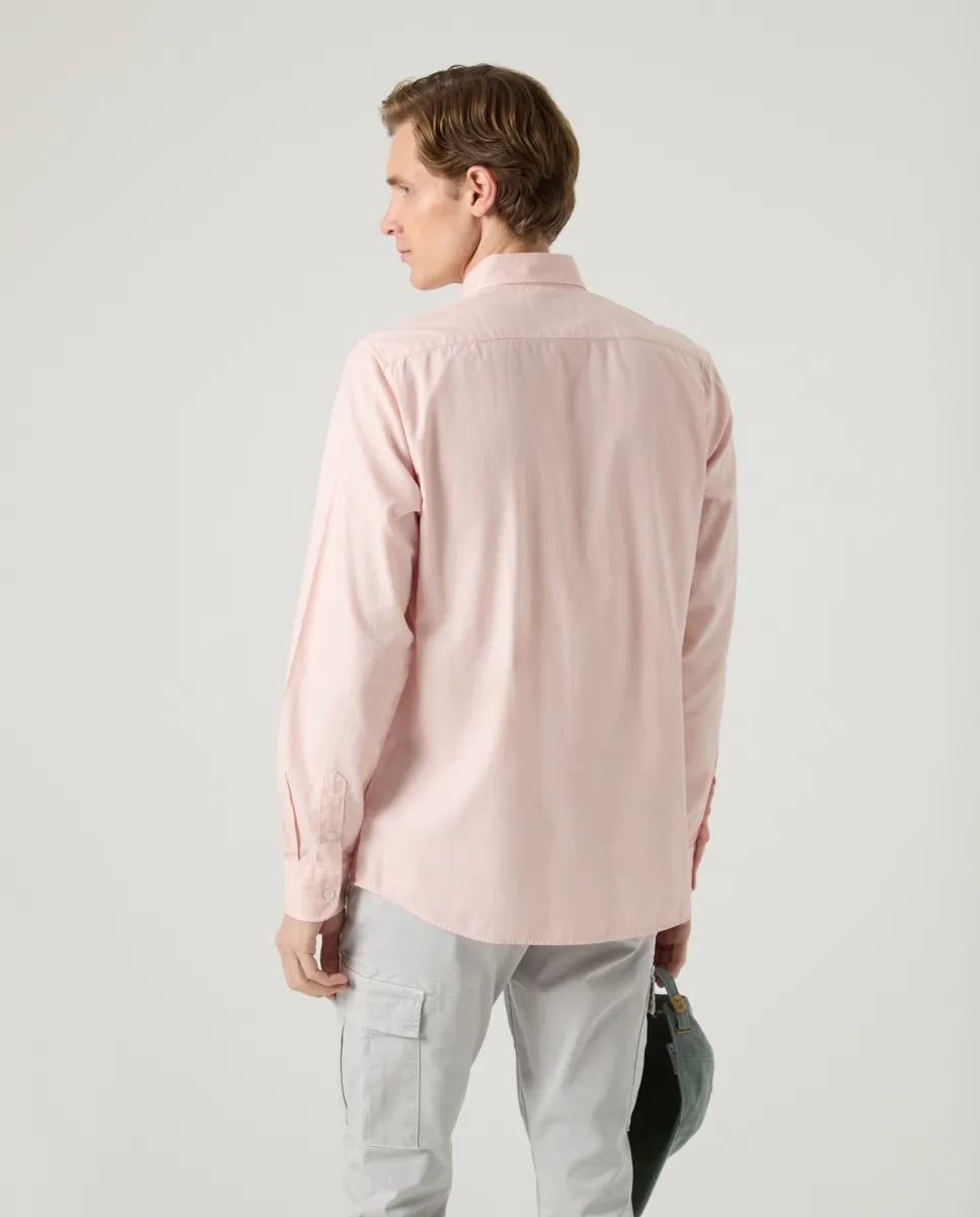 Camisa estructura rosa palo garment dyed, confeccionada en algodón. Diseño de cuello button-down con corte regular fit, manga larga con puño abotonado y cierre frontal con botones personalizados. Detalle de moto bordada en el torso.