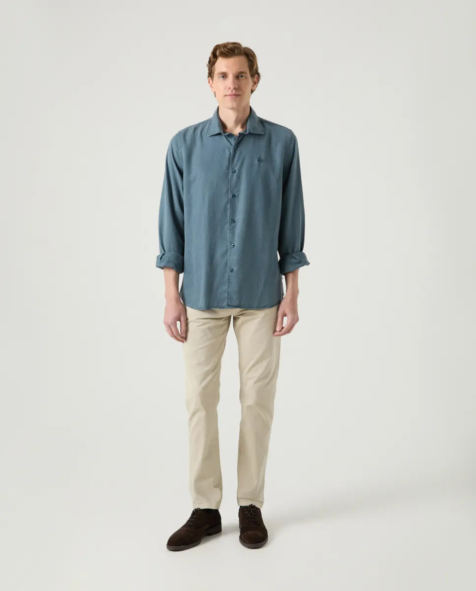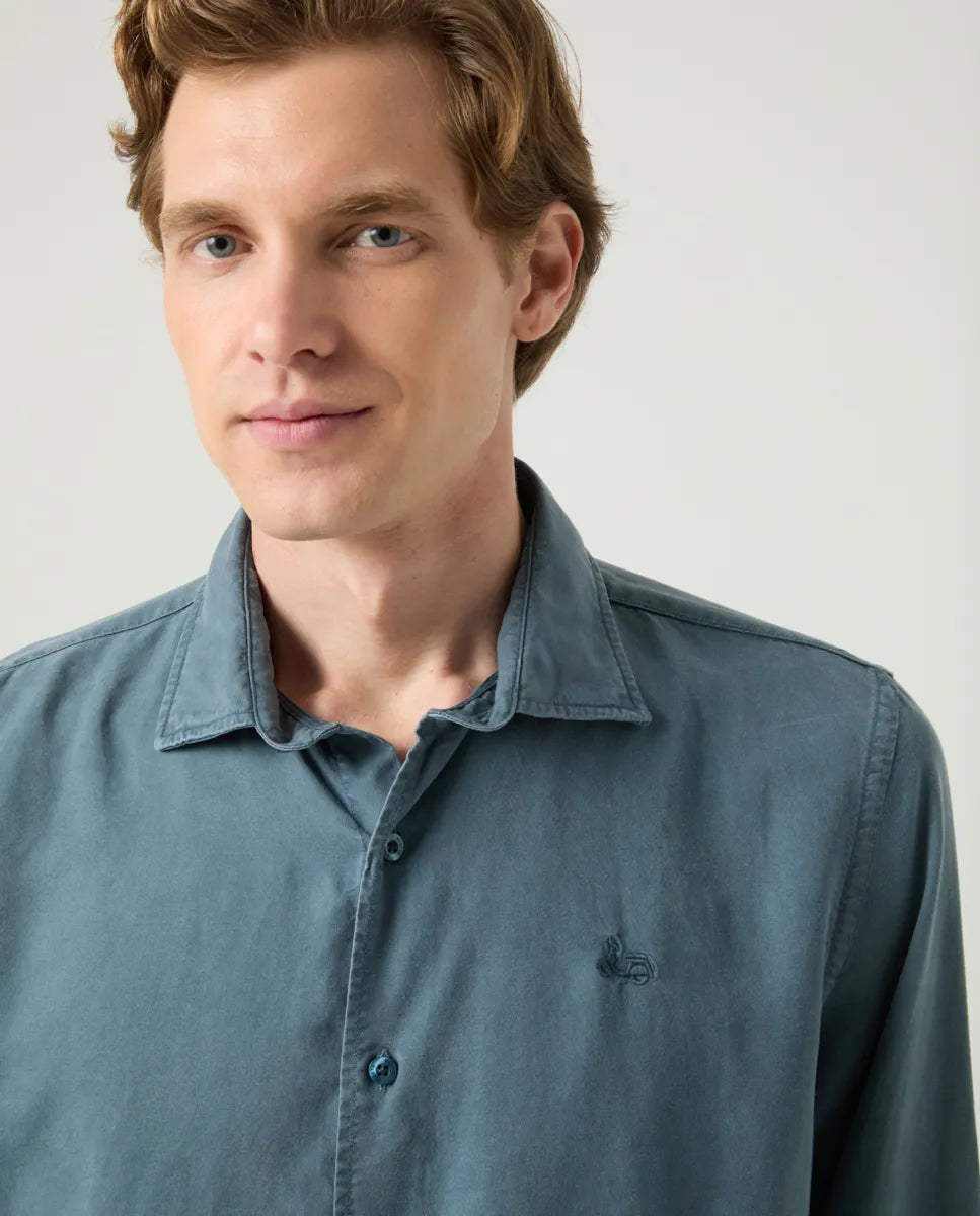 Camisa verde confeccionada en tencel y lino. Diseño de cuello italiano con corte regular fit, manga larga con puño abotonado y cierre frontal con botones personalizados. Detalle de moto bordada en el torso. Fabricada en Portugal.