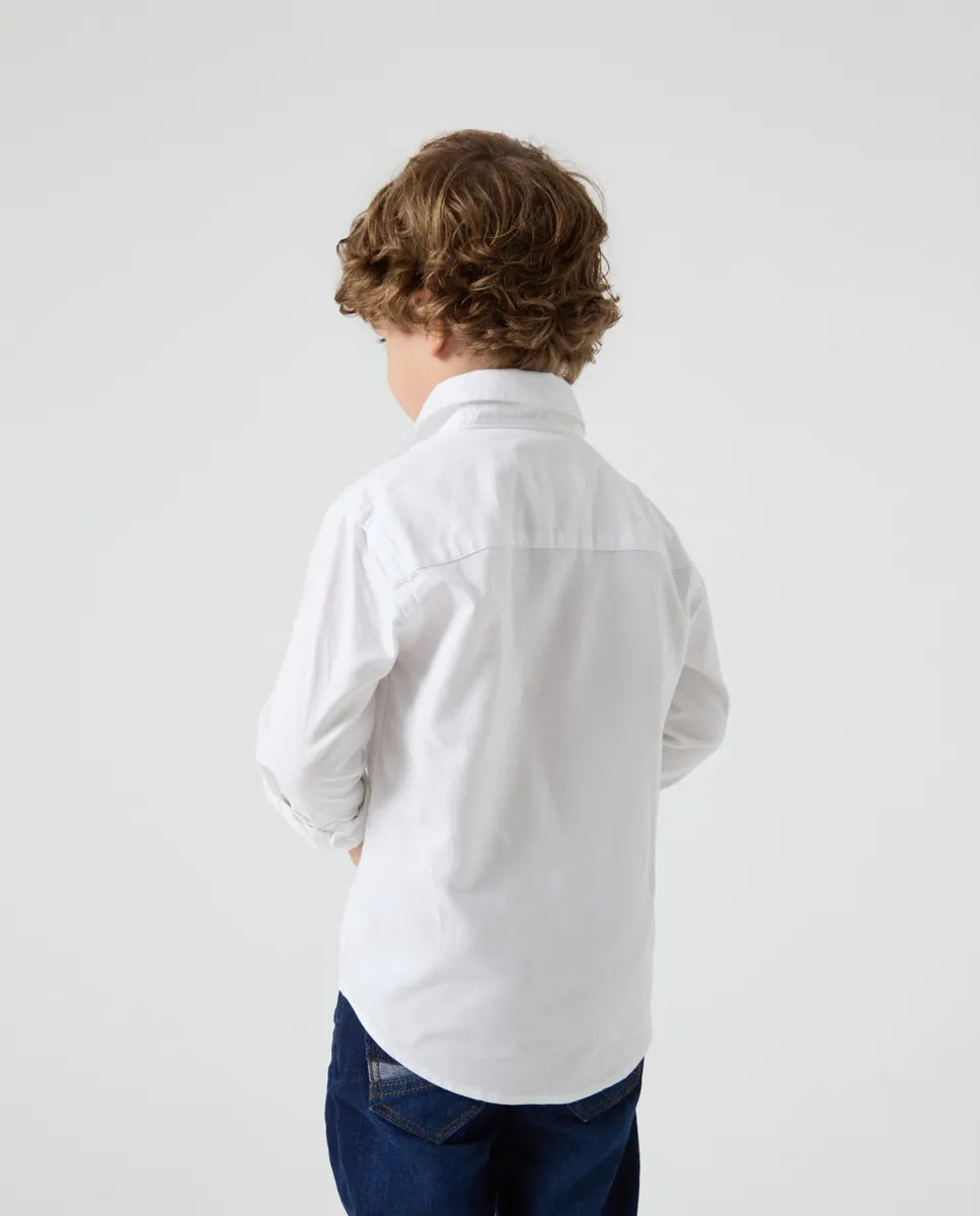 Camisa de niño polera oxford blanca confeccionada en algodón con corte regular fit. Diseño de cuello italiano, manga larga con puño abotonado y cierre frontal con botones personalizados. Detalle de moto bordada en el torso.