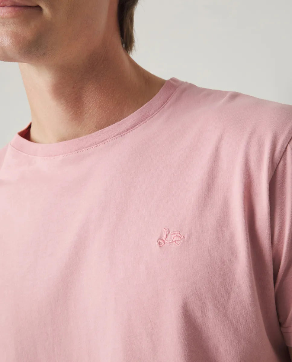 Camiseta básica de corte regular en color burdeos, confeccionada en algodón orgánico. Con cuello redondo y manga corta, es la opción perfecta para un estilo relajado y cómodo. El tejido es ligero y permite la transpiración. Logo de moto bordado en el pecho. Fabricada en Portugal.