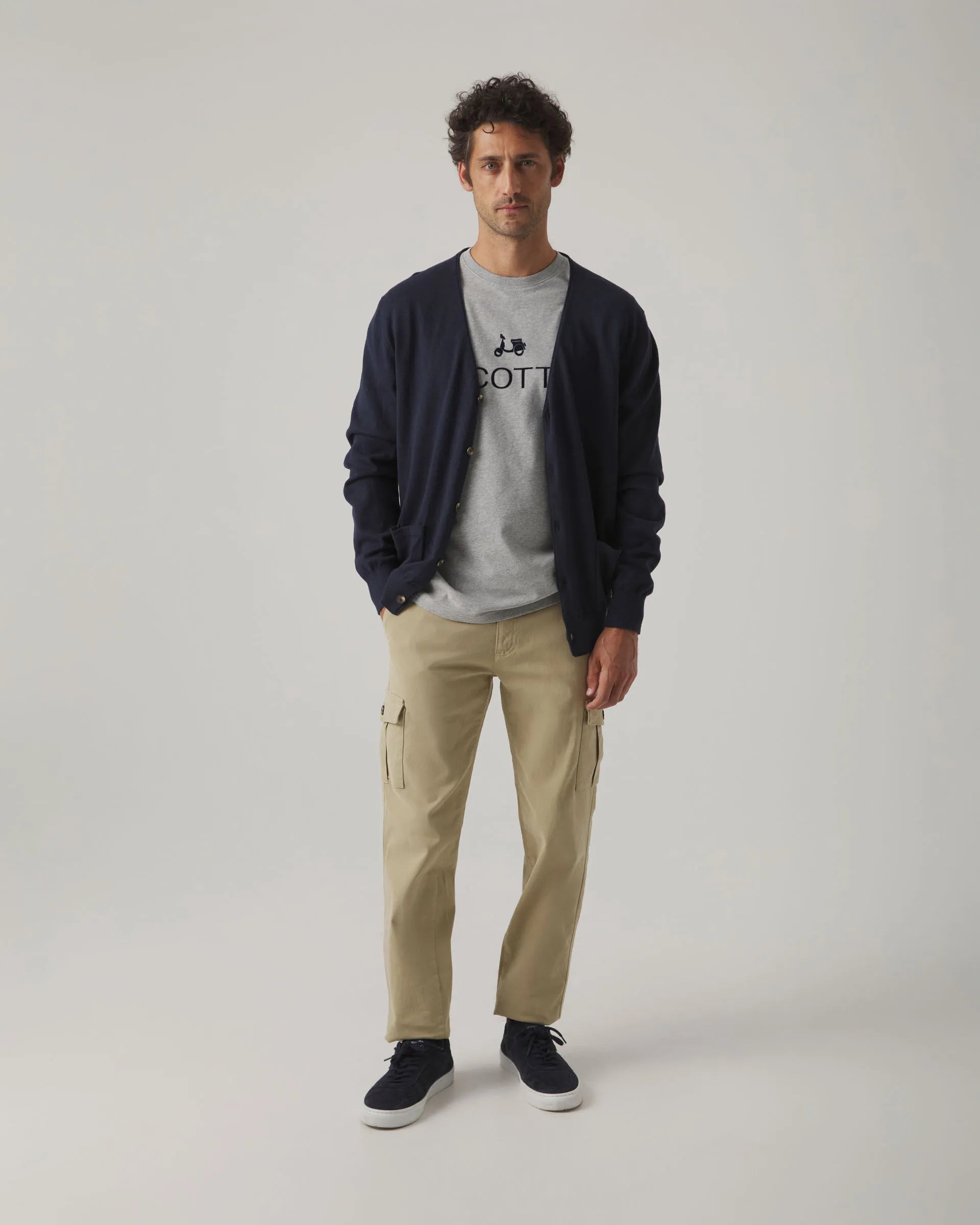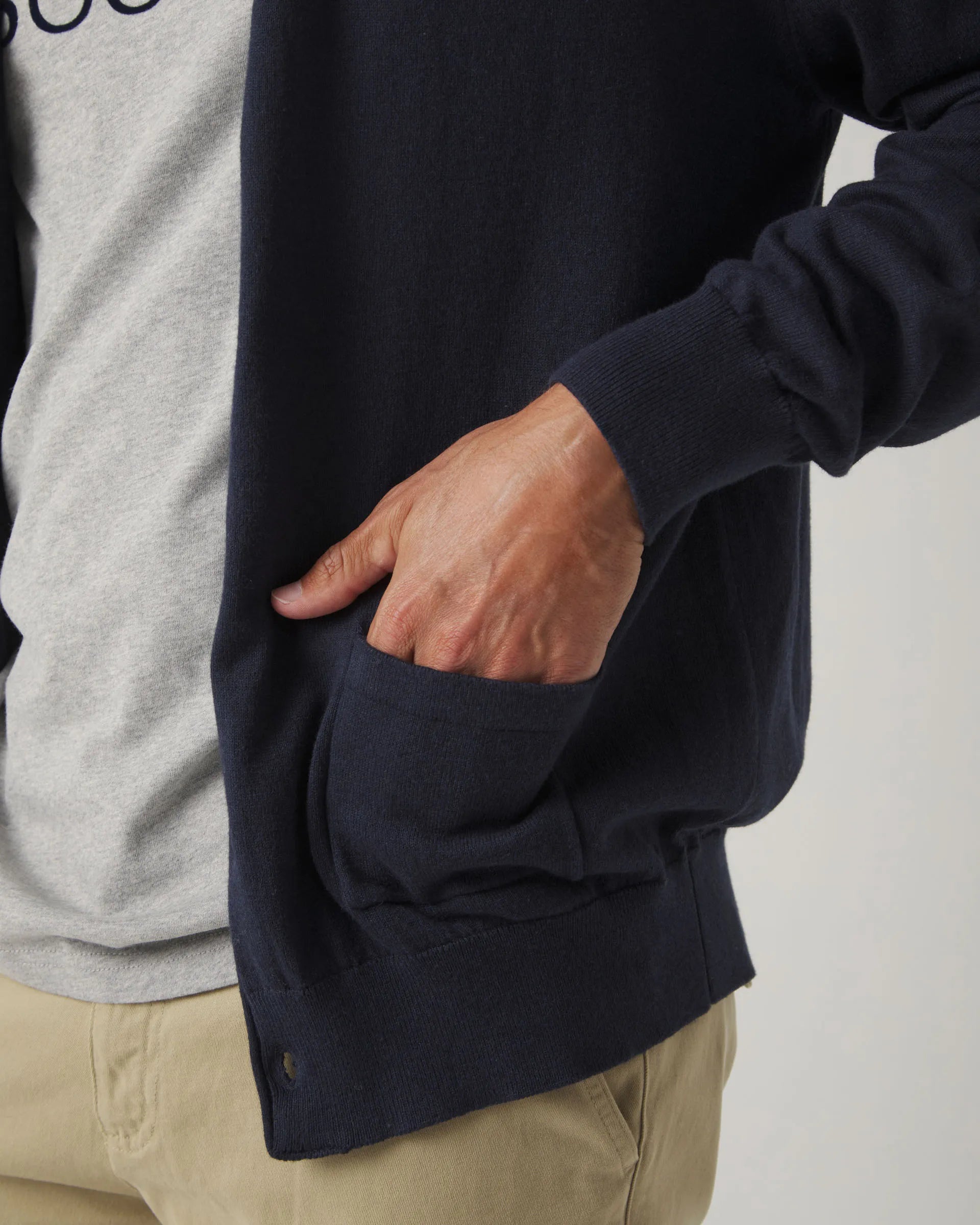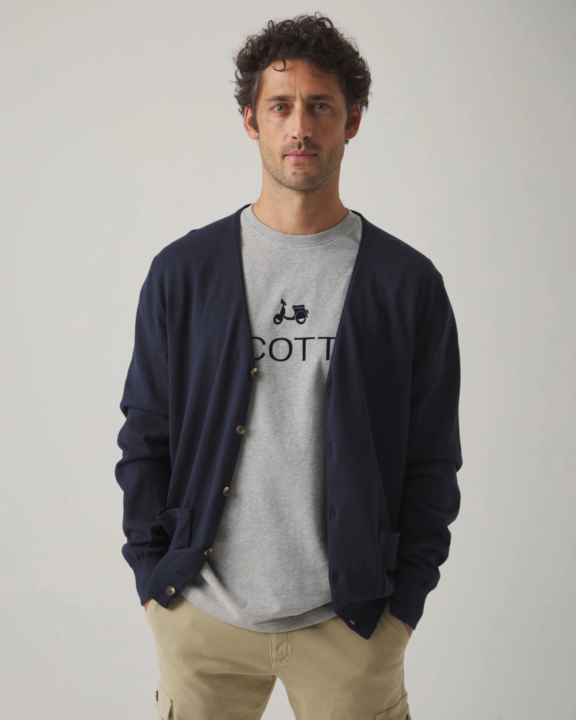Cárdigan clásico azul marino confeccionado en suave lana merina con corte regular fit. Diseño de cuello pico, cierre frontal con botones y manga larga. Detalle de moto bordada en el torso. Perfecto para looks de oficina y días de frío.