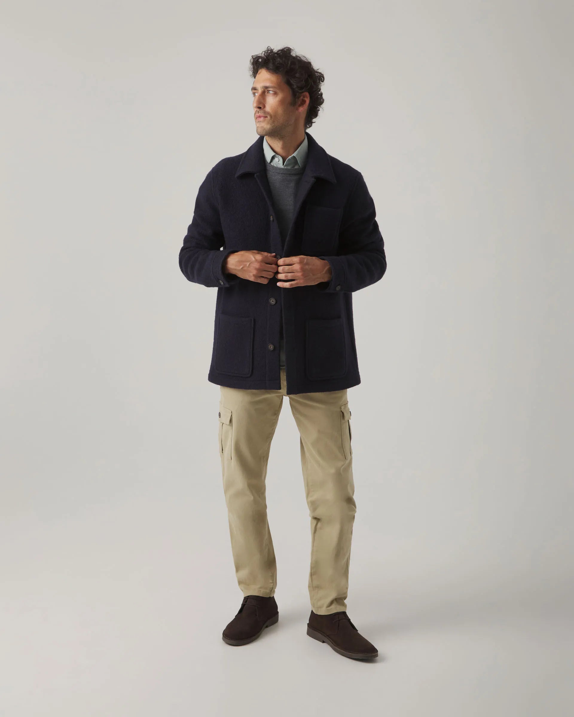 Chaqueta azul marino confeccionada en lana con corte regular fit. Cuello con solapas y cierre frontal con botones efecto cuerno. Cuenta con tres bolsillos y manga larga terminada en puño con botón.