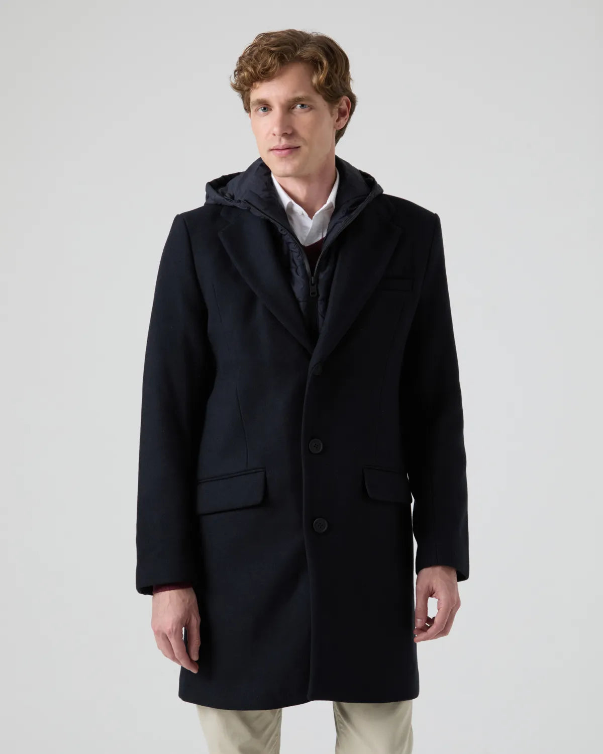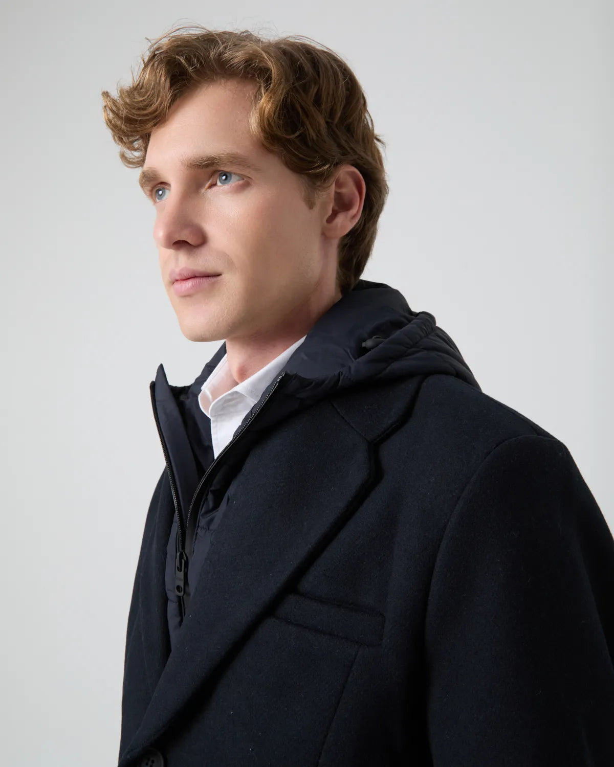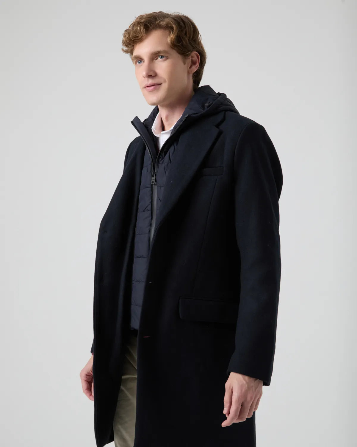 Abrigo azul marino confeccionado en mezcla de tejidos con lana de corte recto. Chaleco interior desmontable con capucha ajustable. Cierre de tres botones personalizados y cremallera. Cuenta con dos bolsillos interiores y dos laterales con solapa. Cuello con solapas, forro interior y manga larga acabada con botones.