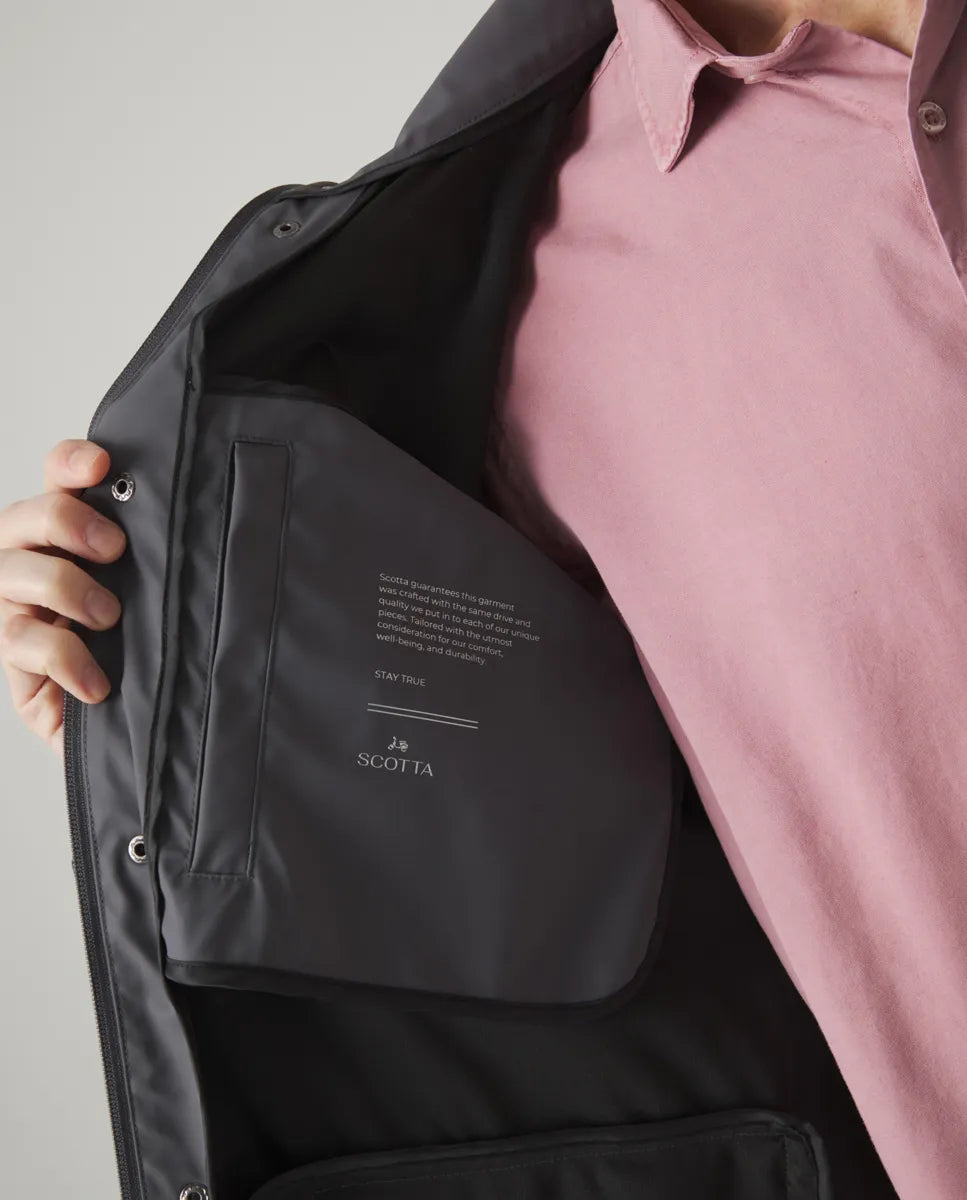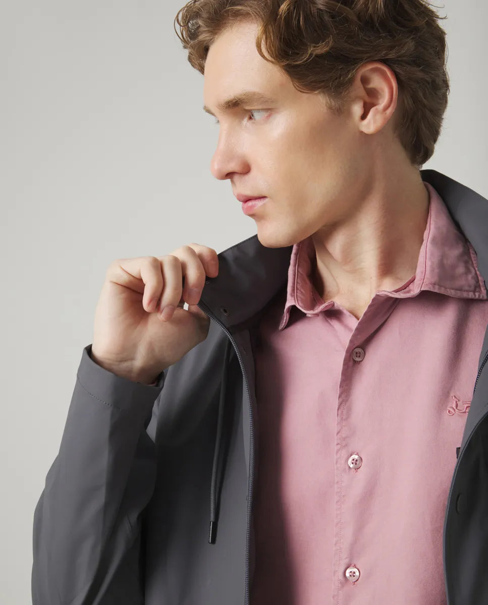 Chubasquero gris oscuro confeccionado en poliuretano con corte regular fit. Doble cierre frontal con cremallera two-way y botones. Costuras termoselladas. Cuello ajustable con capucha y cordón. Bolsillos laterales con solapa y botón. Detella de logo en la manga. Ancho de los puños ajustable con botones de presión.