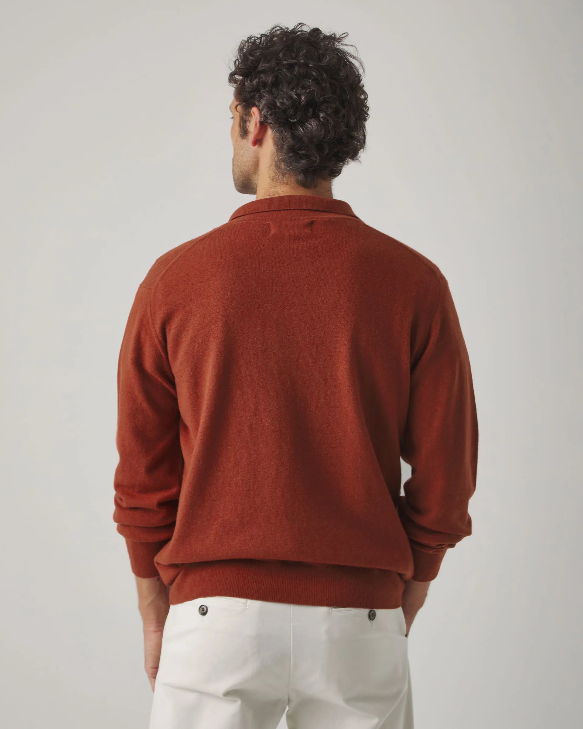 Jersey liso en teja, confeccionado en mezcla de tejido de cashmere, lana, poliamida y viscosa. Corte regular fit. Diseño de cuello polo y manga larga. Aporta calidez y confort en días frescos, perfecto para días de invierno.