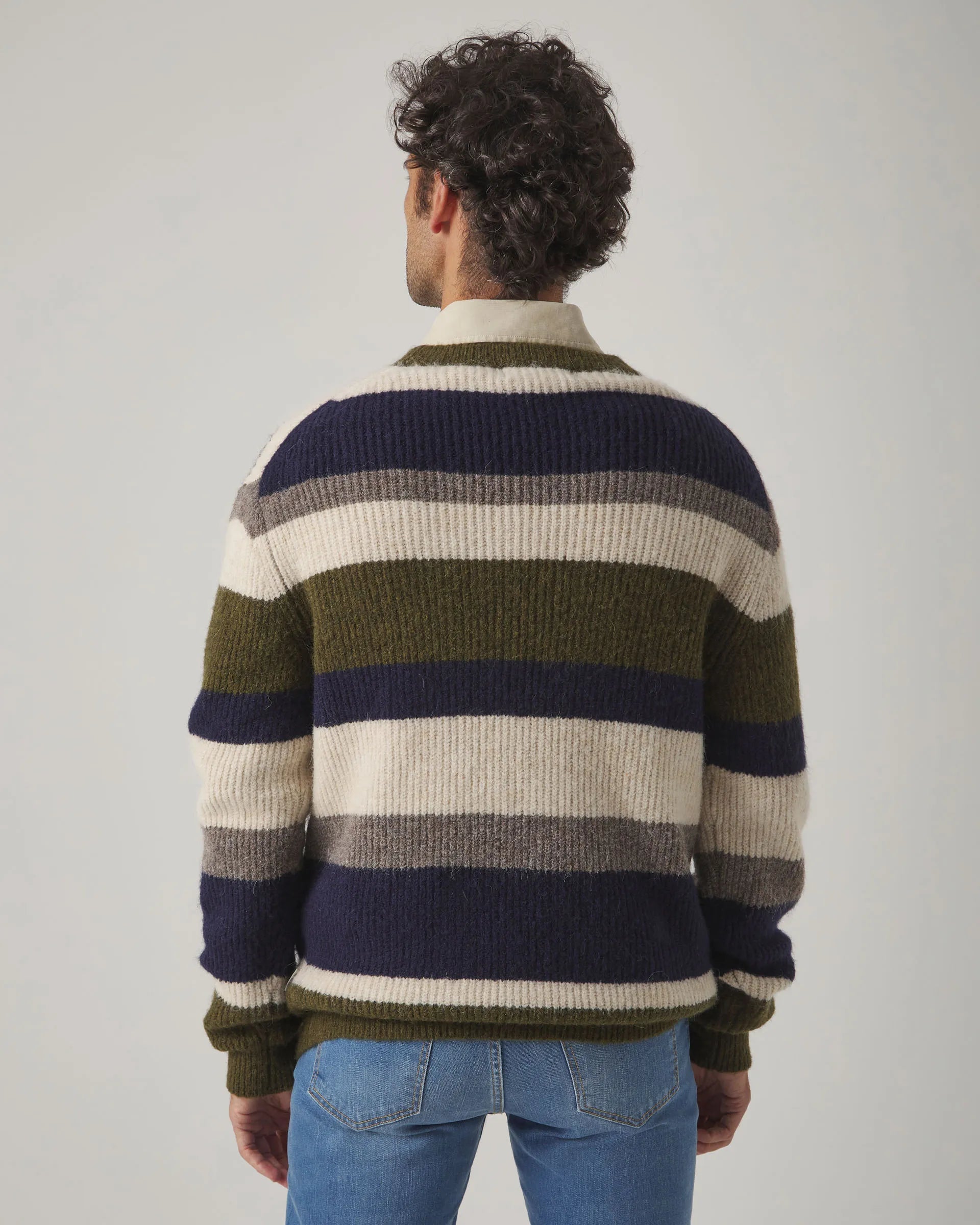Jersey de rayas verde, confeccionado en mezcla de tejidos de lana y alpaca entre otros, con corte regular regular fit. Diseño de cuello redodo, manga larga y detalle de logo en la parte inferior. Aporta calidez y confort en días frescos, perfecto para ocasiones informales.