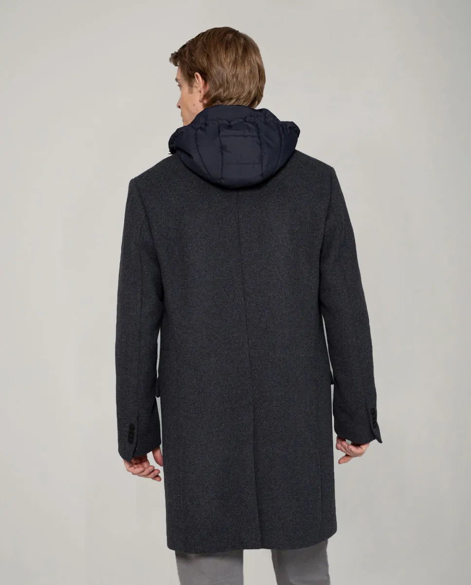 Casaco cinzento escuro. Confecionado em mistura de tecidos com lã. Colete interior removível com capuz. Inclui dois bolsos laterais com aba