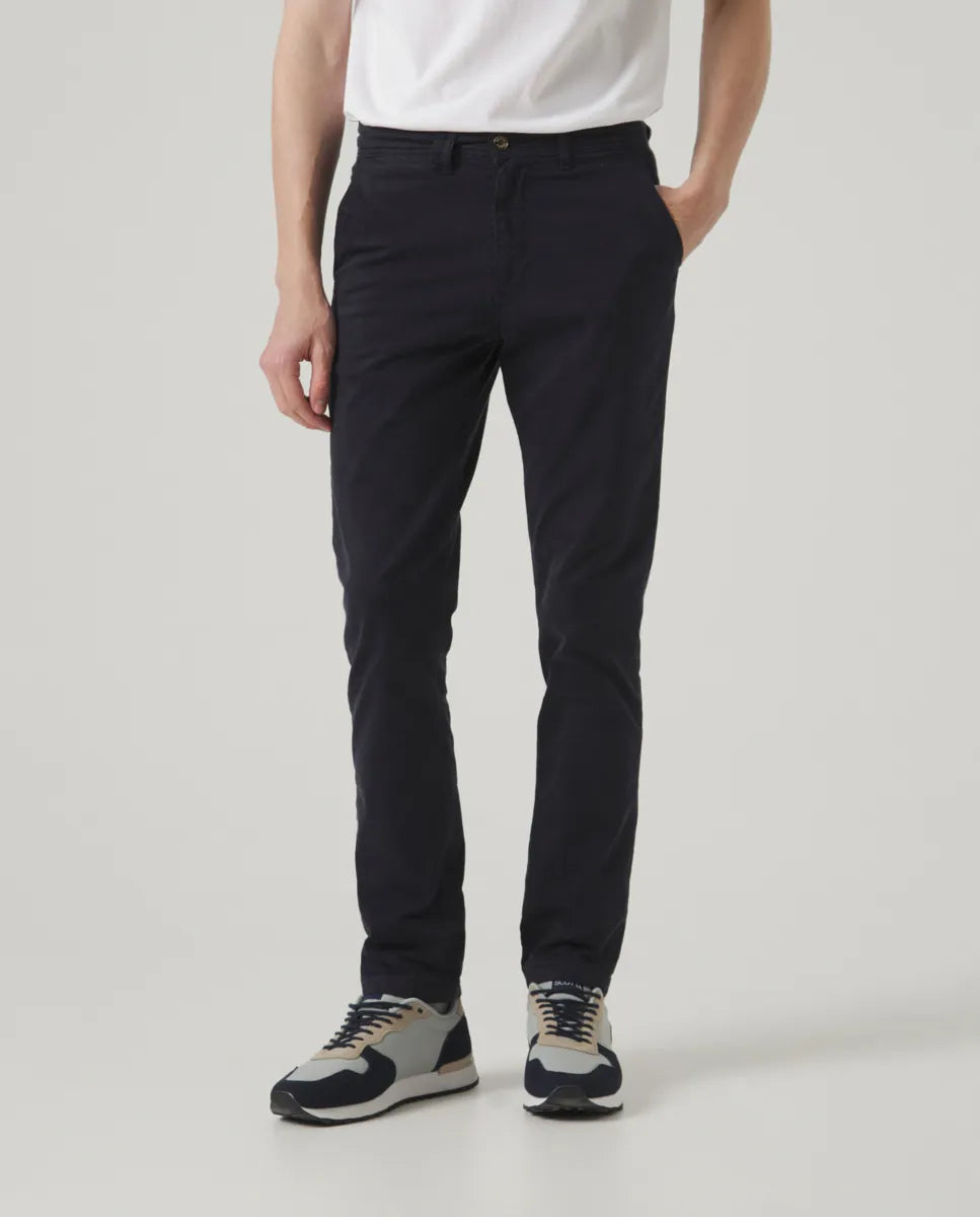 Calças chino azul-marinho de corte regular, confeccionadas numa mistura de algodão e elastano que proporciona liberdade de movimentos. Design com bolsos frontais e traseiros, fecho com botão personalizado e zíper, e presilhas na cintura. Detalhe do bordado da moto no bolso e acabamento garment dyed. Ideais para uso diário ou looks mais formais. Fabricadas em Espanha.