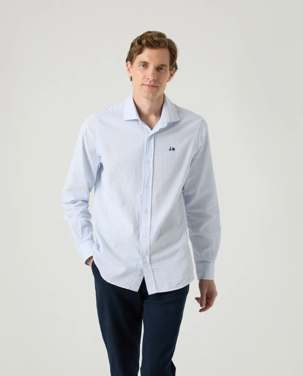 Camisa seersucker com riscas azul-celeste em algodão, leve e respirável graças à sua textura enrugada. Gola italiana, corte regular fit, mangas compridas com punhos abotoados e fecho frontal com botões personalizados Scotta. Logótipo bordado em contraste no peito e prega nas costas para maior conforto.