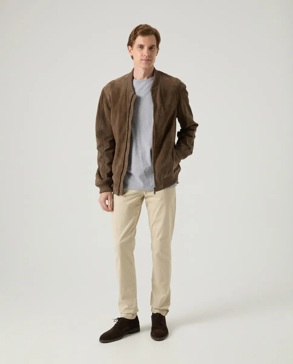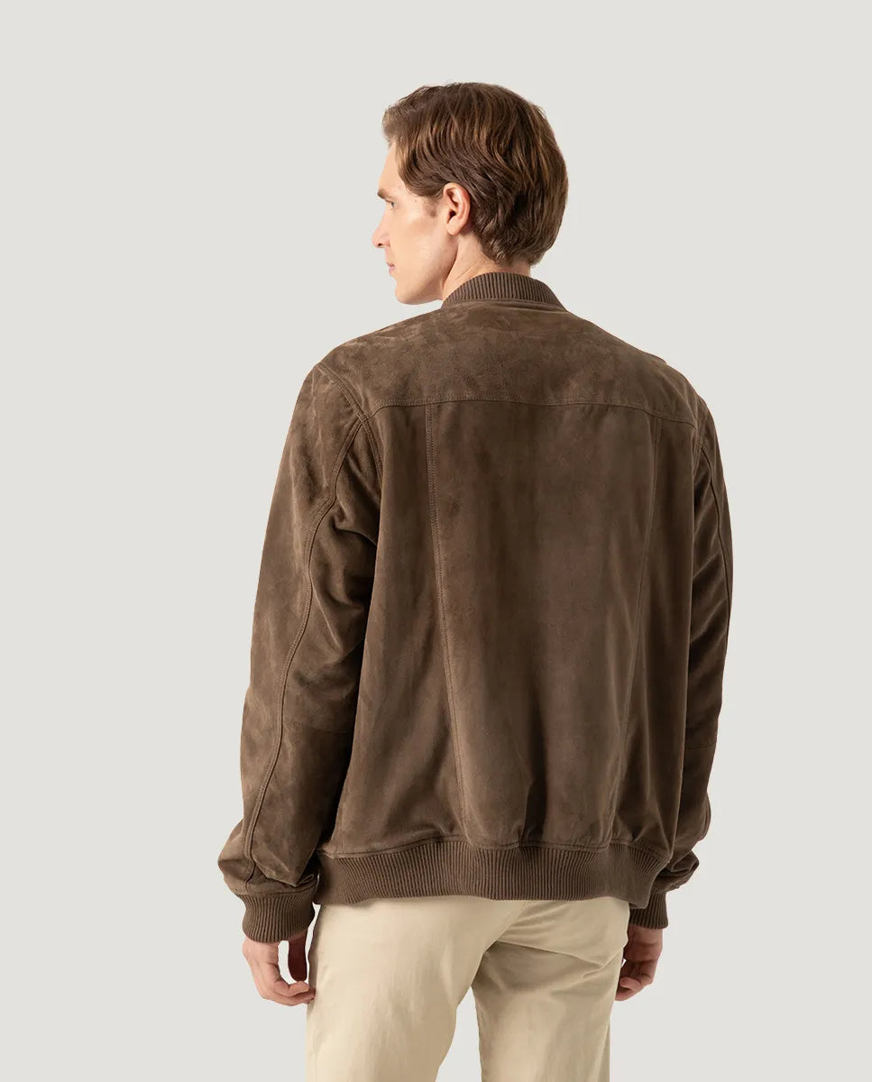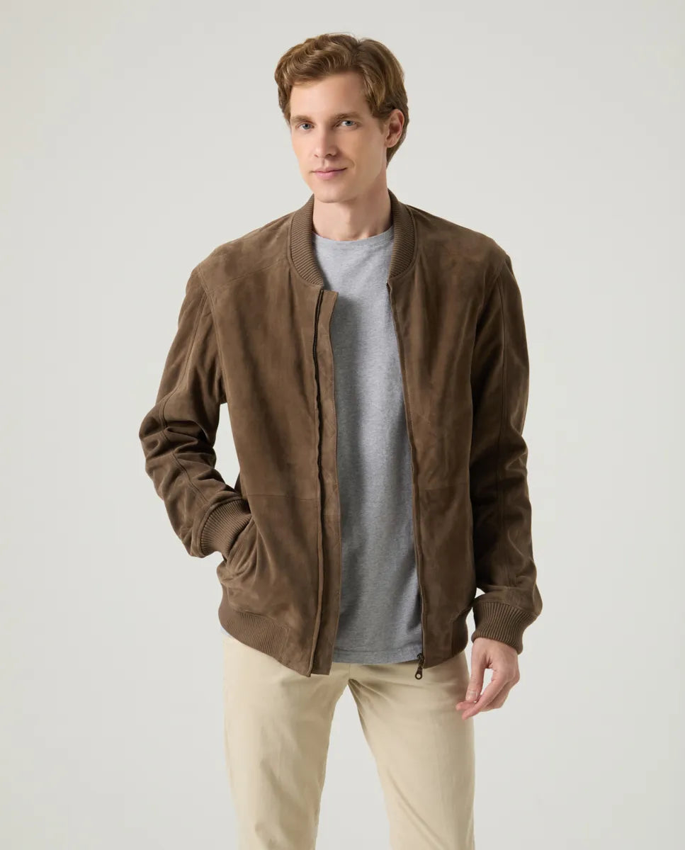 Casaco castanho confeccionado em pele de camurça castanha com corte regular fit. Fecho frontal com zíper e bolsos laterais. Ajustes na bainha e no pescoço que realçam a silhueta.