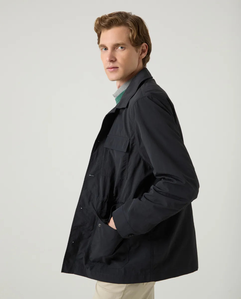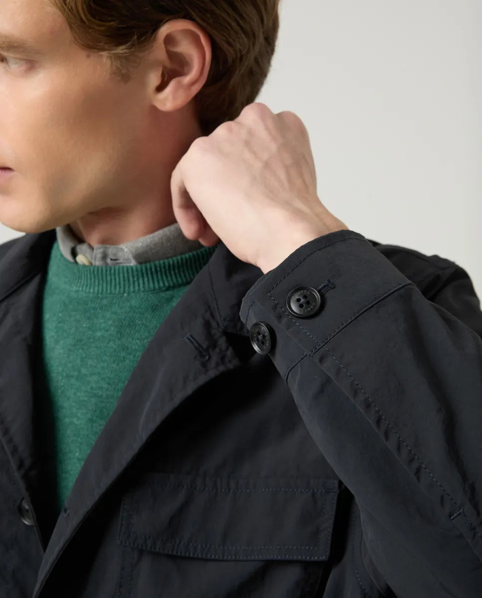Chaqueta ligera en azul marino, confeccionada en nylon y con corte regular fit. Cuatro bolsillos frontales con solapa y un bolsillo adicional en la manga con cierre de cremallera. Tiene ajustadores interiores en la cintura para adaptar el ajuste a la figura y cierre frontal recto con botones. Detalle de logo en la manga.