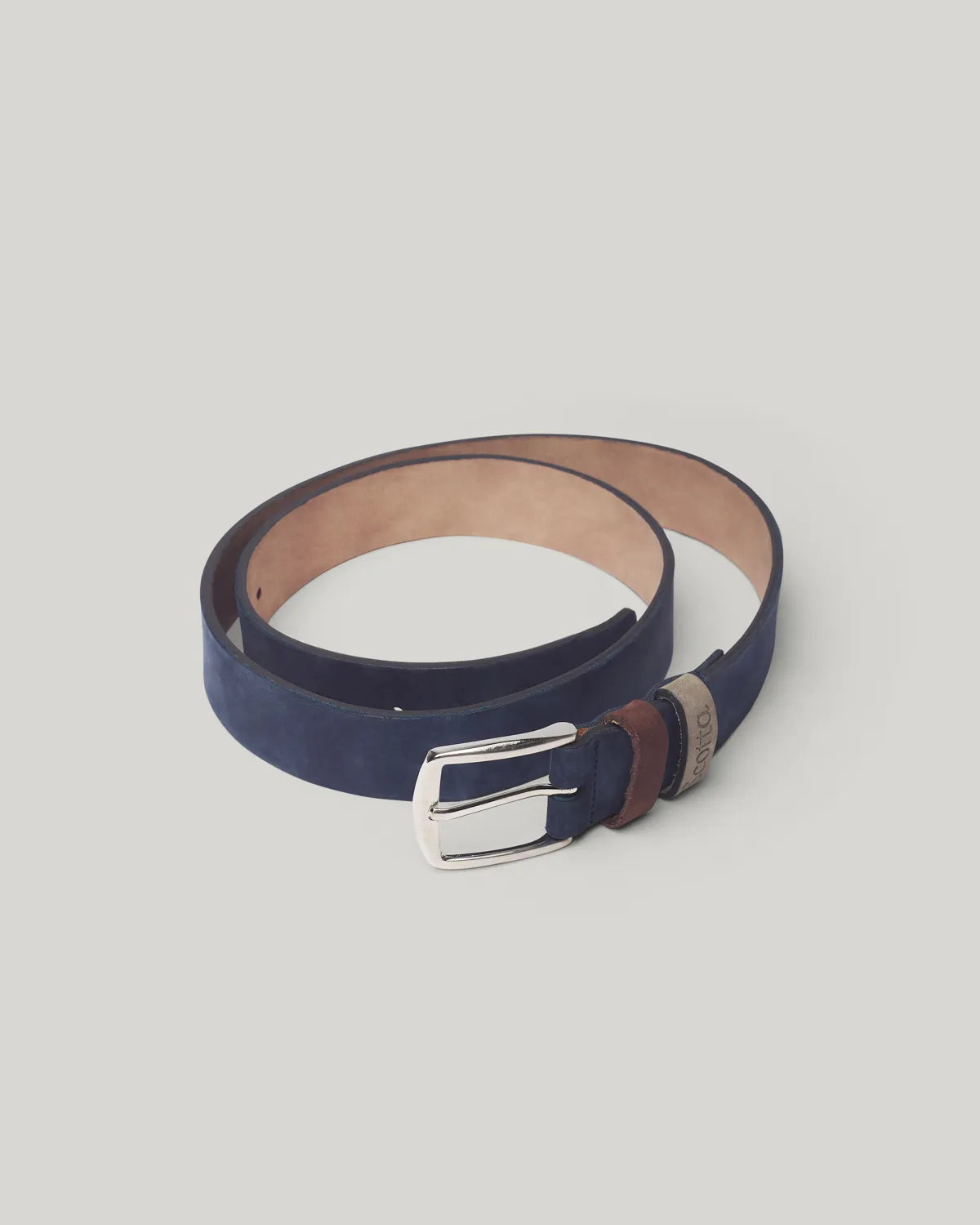 Cinto de couro azul marinho. Fabricado em couro. Fecho com fivela metálica. Presilha personalizada. Logótipo gravado.