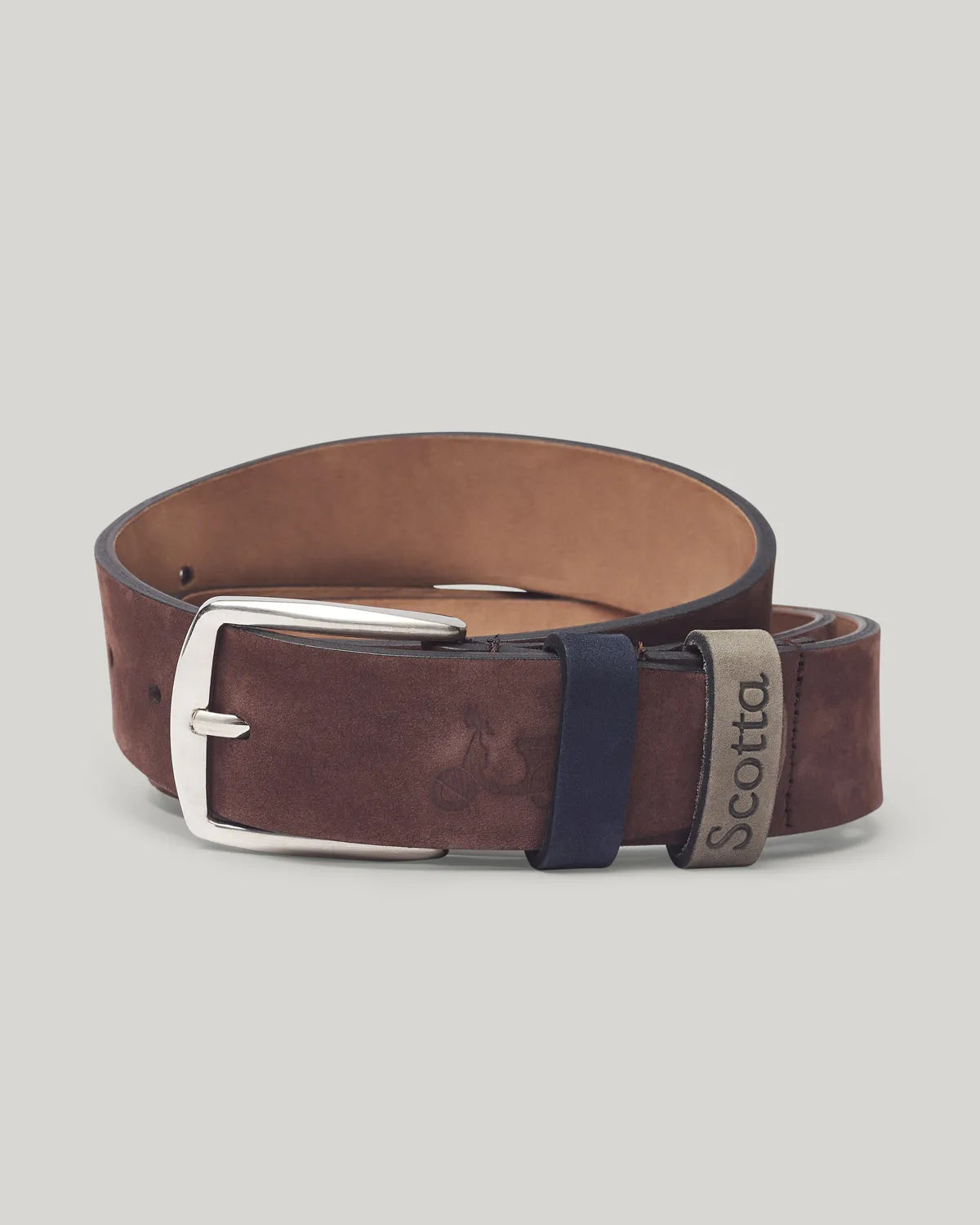 Cinto de couro castanho. Fabricado em couro. Fecho com fivela metálica. Presilha personalizada. Logótipo gravado.