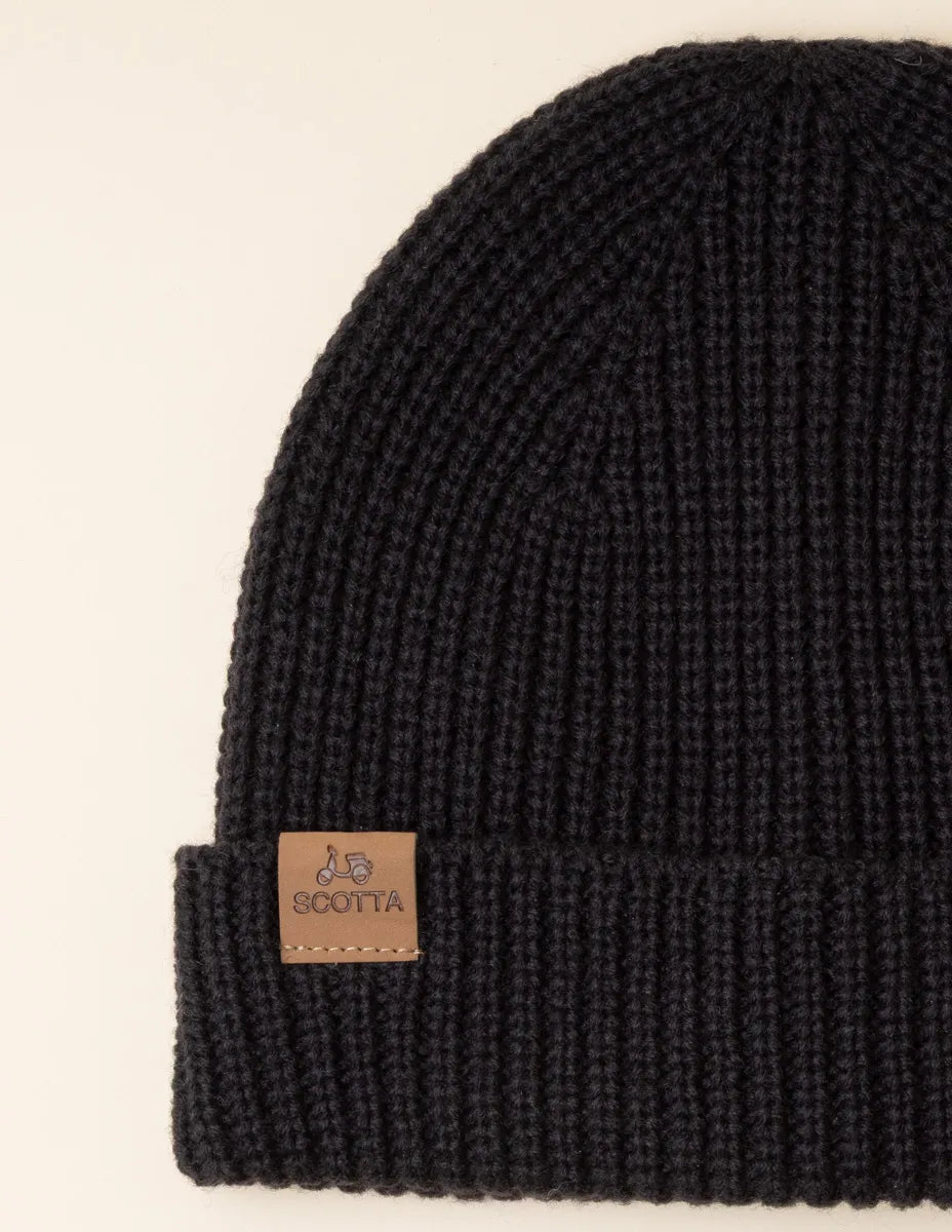 Gorro liso de canalé confeccionado em lã. Detalhe de etiqueta tecida com gravura de moto.