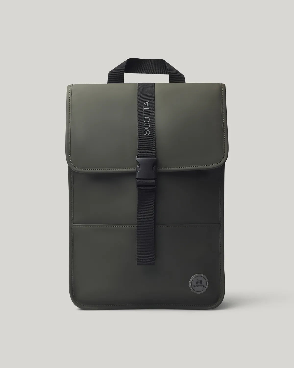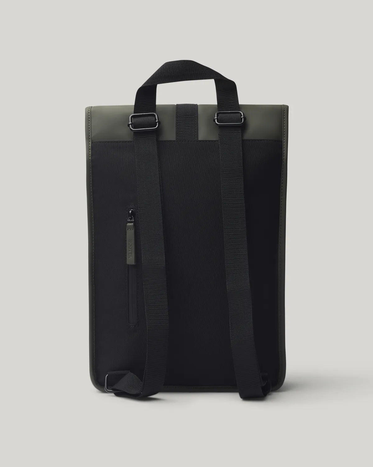 Mochila verde caqui confecionada em tecido PU. Fecho central com clique. Compartimento para portátil. Bolso interior e exterior traseiro com fecho. Pega de mão superior. Ajustes laterais.