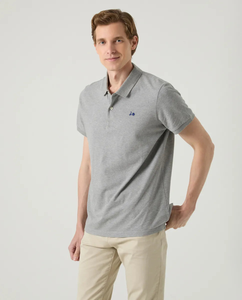 Polo cinzento clássico, de corte regular, confecionado em algodão. Possui gola com fecho de botão personalizado e manga curta. Logótipo da moto bordado em contraste no peito. Fabricada em Portugal.
